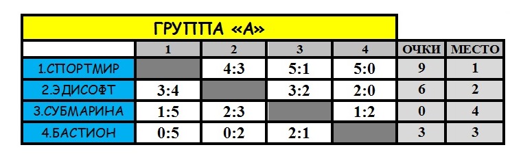 В группе «А» «Спортмир» ожидаемо стал первым, но помучился с «Эдисофтом». Вторую путевку завоевал как раз «Эдисофт» — выиграв свои оставшиеся матчи с небольшим преимуществом. В борьбе за третью путевку «Бастион» все решил в первом матче, минимально обыграв «Субмарину». Последние уступили крупно только «Спортмиру», а два матча проиграли лишь в один мяч и закончили турнир на групповой стадии.