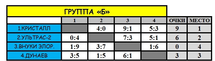 В группе «Б» 3 победы из 3 одержал «Кристалл» с разницей мячей 18:4. Второе место занял «Ультрас-2» снова, как и в недавнем пляжном турнире, усиленный игроками из других команд лиги. Третьим стал «Дунаев» опередивший аутсайдера группы «Внуков Элорана», которые за 3 матча пропустили аж 22 мяча.