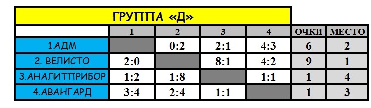 В наконец, в последней группе «Д», максимальное количество очков набрал «Велисто». Вторым финишировал «АДМ», выиграв два своих других матча в один мяч. «Аналитприбор» и «Авнгард» сыграли между собой 1:1, набрали в итоге по 1 очку, но по лучшей разнице мячей в плей-офф вышел «Авангард».
