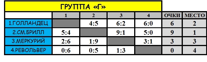 Победу в группе «Г» в очном поединке с «Голландцем» (5:4) одержали «Смоленские бриллианты». «Голландец» уверенно стал вторым. С третьего места вышел «Меркурий», одержавший одну победу. «Револьвер», забив лишь один гол стал последним.