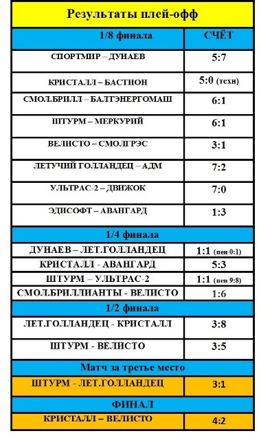 В своих полуфиналах «Кристалл» не оставил шансов «Голландцу» — 8:3, а «Велисто» не пустил дальше «Штурм» — 5:3.