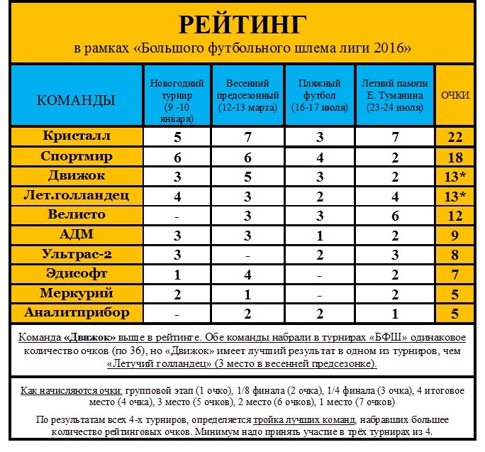 В результате обладателем «Большого футбольного шлема СЛФЛ» стала команда «Кристалл», набравшая 22 очка. Если бы не осечка в последнем турнире, то «Спортмир» мог бы рассчитывать также на общую победу, а пока только второе место (18 очков). Третьим стал «Движок», опередивший по дополнительным показателям «Летучий голландец» (по 13 очков). Обе команды набрали в турнирах «БФШ» одинаковое количество очков (по 36), но «Движок» имеет лучший результат в одном из турниров, чем «Летучий голландец» (3 место в весенней предсезонке).