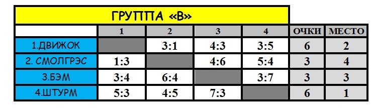 В группе «В» развернулась самая ожесточенная борьба между всеми 4 командами, все счета были с небольшим преимуществом одной из команд. В результате 2 команды набрали по 6 очков и 2 команды по 3 очка. По результатам личных встреч места распределились так: «Штурм» опередил «Движок», а «БЭМ» — «СмолГрэс». Кстати, команда из Озерного единственная из всех команд, занявших 4-е места набрала 3 очка и вышла также в плей-офф.