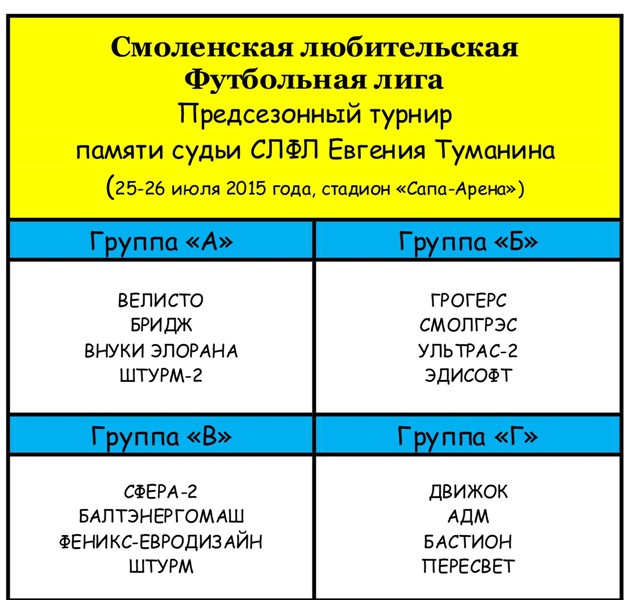 25-26 июля 2015 года на стадионе Сапа-Арена прошёл предсезонный турнир перед осенним чемпионатом в формате 6х6. Оргкомитет лиги решил предсезонный турнир перед осенним чемпионатом в этом году посвятить судье СЛФЛ Евгению Туманину, трагически погибшему вавтокатастрофе в мае 2013 года. Идея проводить турнир памяти Евгения возникла в прошлом году, благодаря Андрею Иванову, организатору команды «Штурм», за которую Евгений выступал в соревнованиях как футболист. В 2014 году он собрал 4 команды: Штурм, Штурм-2, Сборную НСФЛ и Сборную СЛФЛ. Турнир проходил на искусственном поле СОШ № 15. В том году на турнире смогли быть родители Евгения и его жена Александра. В этом году к сожалению никто из них не смог быть турнире по объективным причинам: родители живут далеко (г.Петразаводск) ,а супруга была на повышении квалификации в г.Москве.