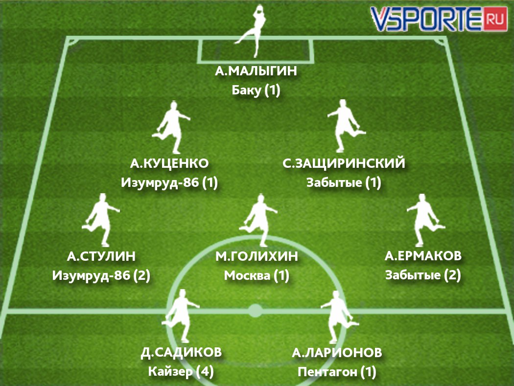 Очередной всплеск активности «Забытых» после пропущенного гола снова на нет свели Малыгин и его партнеры, а розыгрыш стандарта у ворот Николая Карлина на 10-й минуте встречи снова привел к голу. Мяч был доставлен во вратарскую, на мгновение заметался на линии ворот, а через секунду от ноги Дениса Захарова вполз за линию. Пока «Забытые» приходили в себя, защитник «Баку» Александр Цыбиков протащил мяч по левой бровке и прострелил в штрафную, где никем не прикрытый Рагим Садыхов в третий раз отправил мяч в сетку ворот Карлина. 3:0 – неплохо для дебюта!